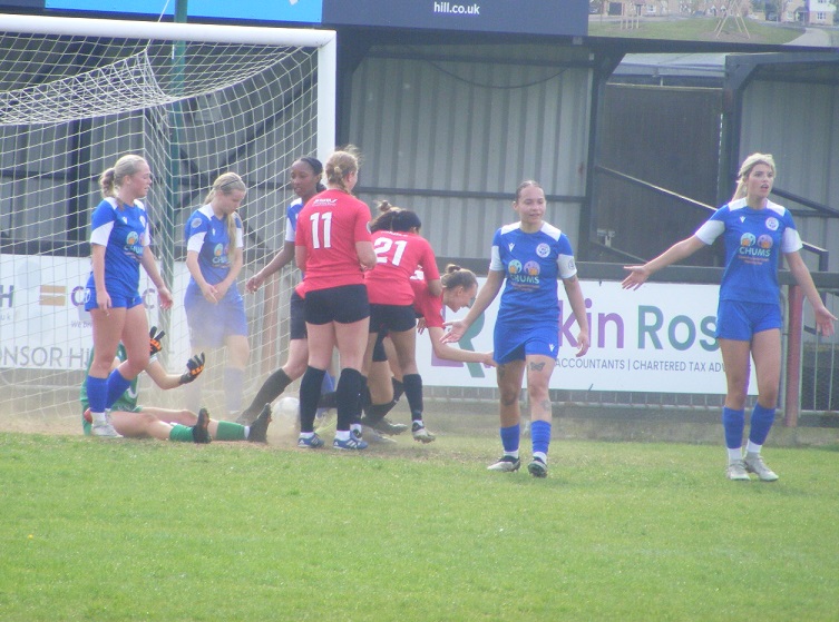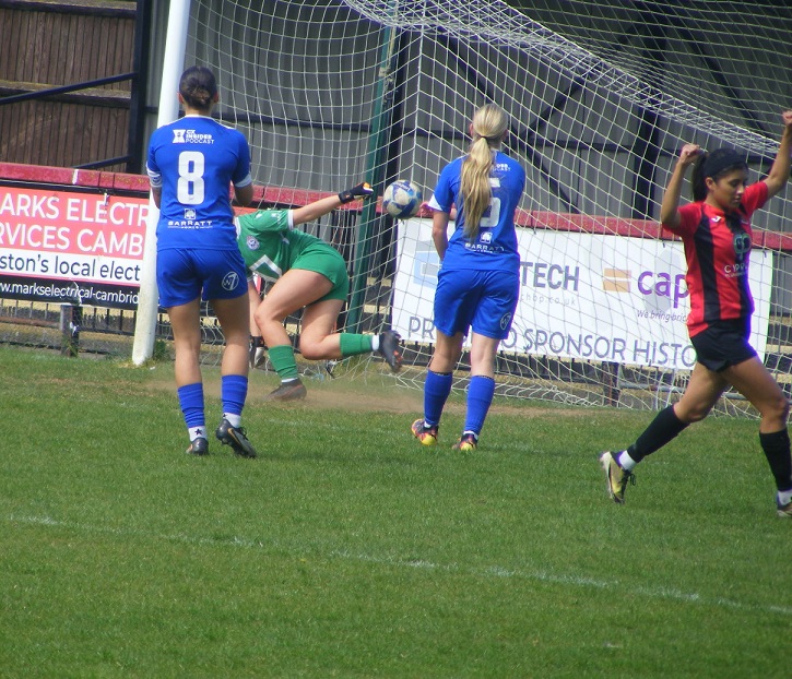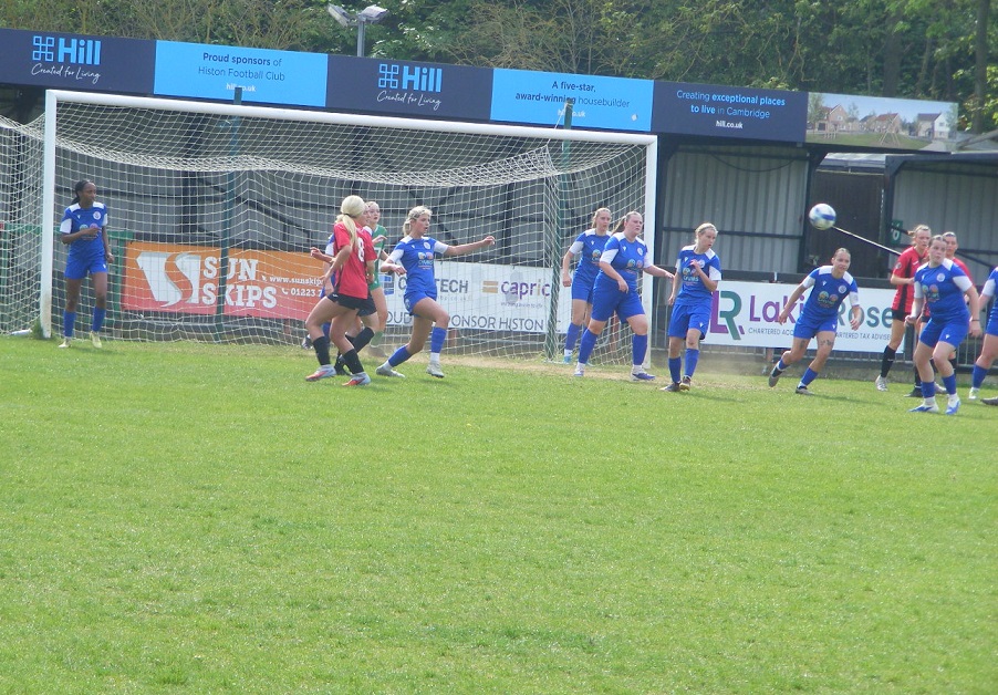 Histon winning a free-kick deep on the right flung up into the box defended by Cook out to the right, Collins getting it back for the hosts pushing on up the line winning a corner kick. The corner cleared comes out to Banks central again, less time this time snatching a the shot clips it up over the bar. Christie sliding in to stop, Ghosh’s cross from the right out off her for a goal-kick.
