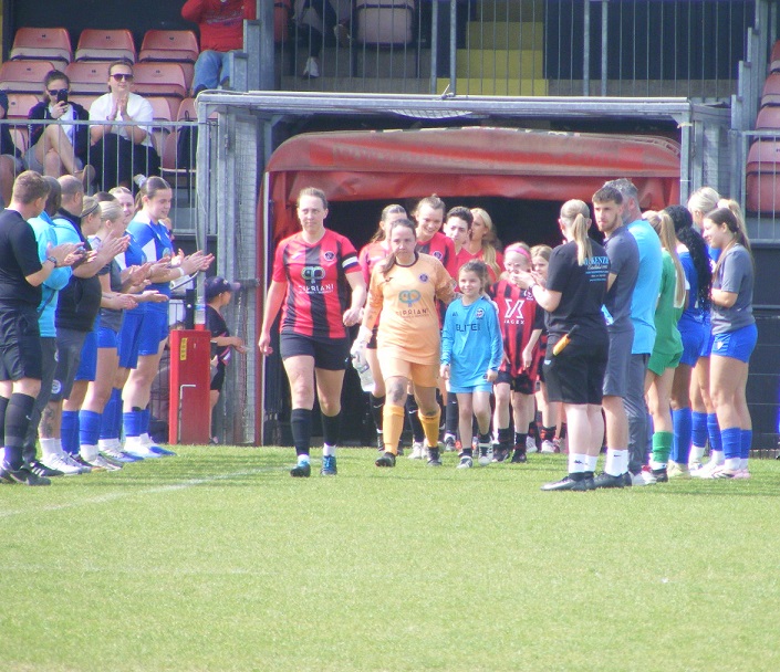Histon FC’s, Bridge Road Stadium the venue for this afternoon’s game, features a large grass pitch, fairly dry with a puff of dust on the surface with not alot of rain falling recently (can’t complain on that front). Just off the A14 north of Cambridge itself. A bright sunny day with little cloud in the sky pleasantly warm. The bar at the back of the main stand open serving hot and cold drinks. Viewing all round with a covered seated stand running the length of the pitch on the opposite side. The Dunstable players and coaching team forming a guard of honour to welcome champions Histon as they walk out onto the pitch with their mascots from Histon Hornets girls.