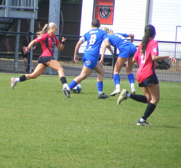 Sabrina Ghosh’s early goal the difference between the two sides as they head back into the changing rooms for the half-time interval. The hosts moving the ball about the pitch using the space getting players on down the wings. Dunstable working hard at the back to limit space has made it difficult to get players out quickly to support the attackers limit their own opportunities in attack. Histon’s goal coming from an error have had 3 or 4 more good opportunities to extend the lead but have nevertheless looked composed at the back comfortable defending their narrow advantage.